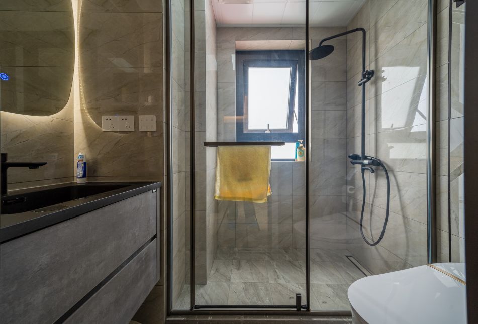 主衛(wèi)使用率也很高,鉆石形的淋浴房使空間得到合理利用;整體的色調(diào)與材質(zhì)搭配非常有質(zhì)感。