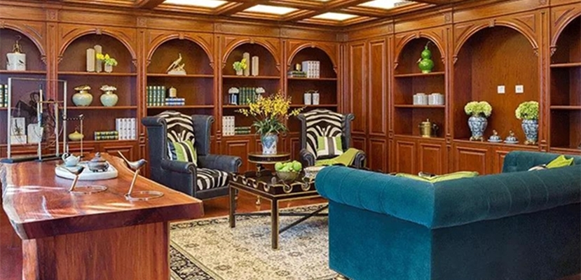整體以古韻的中式設計元素,墻面的木質飾面板+金屬線條裝飾,還有實木的中式家具布置,細節里禪意精致的圓形造景設計,也讓空間顯得更加端莊檔次。